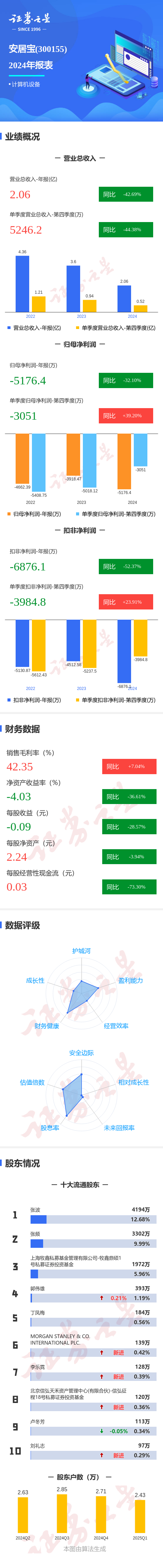 证券之星消息,安居宝2024年年报显示,公司主营收入2.07亿元,同比下降42.7%;归母净利润-5176.41万元,同比下降32.1%;扣非净利润-6876.1万元,同比下降52.38%;其中2024年第四季度,公司单季度主营收入5246.2万元,同比下降44.38%;单季度归母净利润-3051.01万元,同比上升39.2%;单季度扣非净利润-3984.81万元,同比上升23.92%;负债率11.02%,投资收益961.92万元,财务费用-1080.67万元,毛利率42.35%。